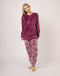 Pigiama realizzato in morbido interlock unito, un tessuto caldo e confortevole perfetto per la stagione invernale. Il modello è impreziosito da delicati inserti in pizzo sul collo e sui polsi, che aggiungono un tocco romantico e raffinato. La maglia presenta unapertura con 4 bottoni e un taglio morbido che assicura massimo comfort. Pantalone con fondo dritto, ideale per chi ama uno stile elegante anche nei momenti di relax.