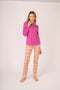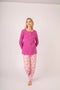 Pigiama da donna in morbido interlock, ideale per la stagione invernale. La maglia con collo serafino presenta due bottoni e una delicata fantasia a cuori, mentre il pantalone in tinta unita completa il completo, garantendo comfort e uno stile dolce e femminile anche nei momenti di relax.