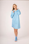 Abito da casa realizzato in morbido interlock, ideale per la stagione invernale. Il modello presenta un collo a camicia con apertura frontale a quattro bottoni a forma di cuore e una delicata fantasia a cuori su sfondo azzurro, per un look romantico e femminile. Il taglio morbido garantisce massimo comfort, perfetto per rilassarsi in casa con stile. Composizione: 100%COTONE